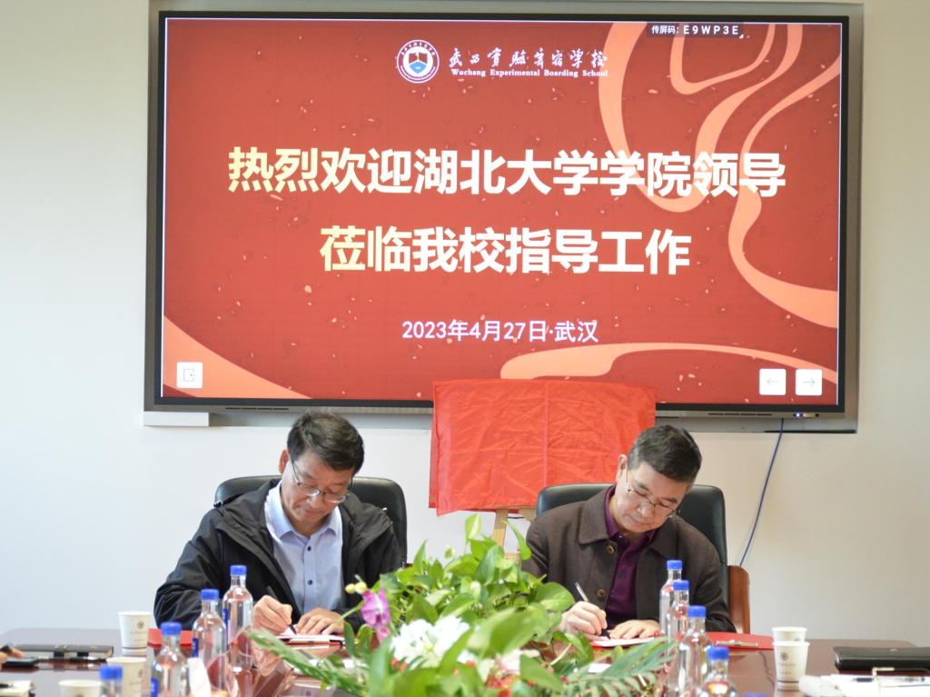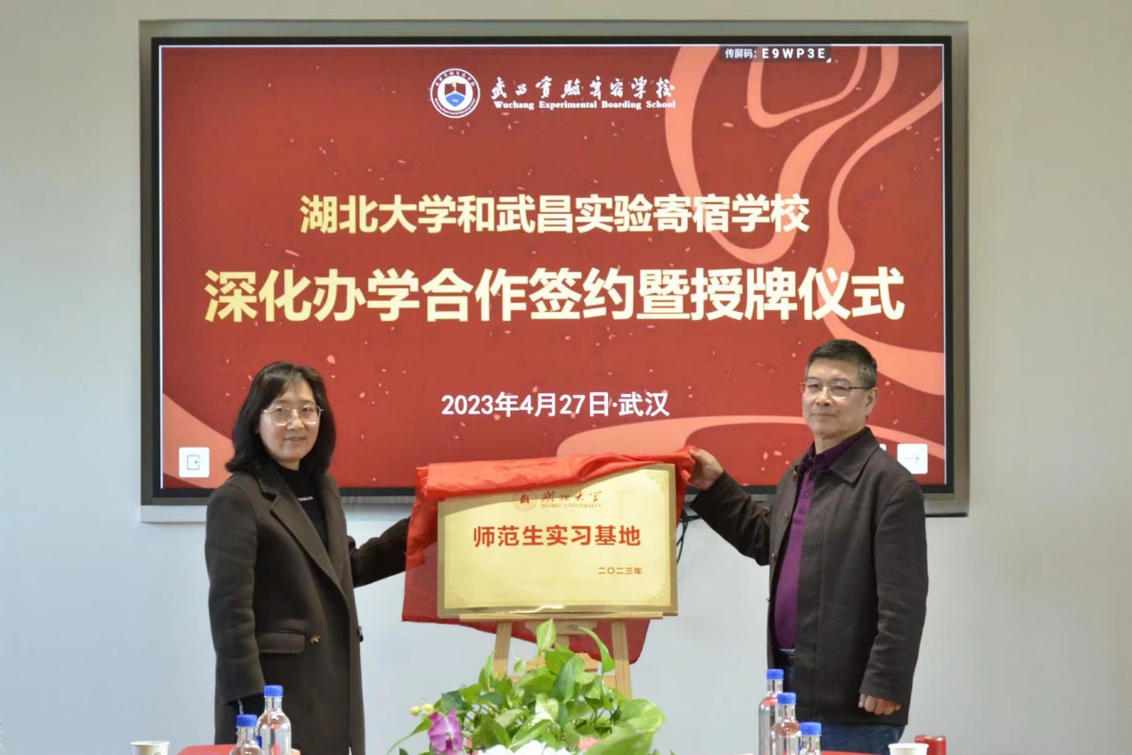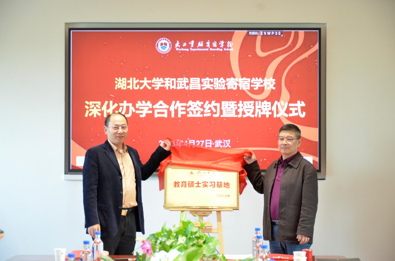 4月27日,beat365官方网站与武昌实验寄宿公司共建师范生和教育硕士实习基地签约暨授牌仪式隆重举行。武昌实验寄宿公司董事长戴先琼、董事长赵明,beat365官方网站外国语公司经理陶涛、beat365副经理祝逸明等共同出席签约授牌仪式。仪式由行政管理中心主任徐杨超主持。