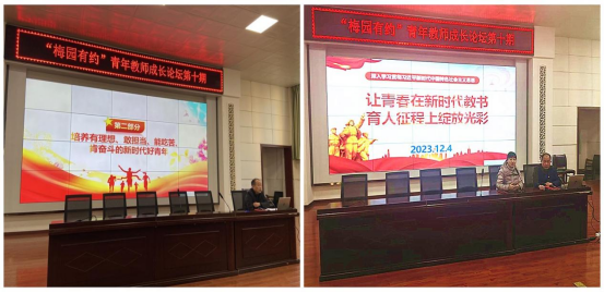为深入学习贯彻习近平新时代中国特色社会主义思想,助力青年教师更好更快成长,2023年12月4日下午,第十期“梅园有约”青年教师成长论坛在将军路中学举行。beat365官方网站委托管理团队邀请将军路中学王朝英书记做“让青春在新时代教书育人征程中绽放光彩”的讲座。湖大专家于洋副教授、将军路中学赵群立董事长、刘小琴副书记以及全体青年教师参加了论坛活动。