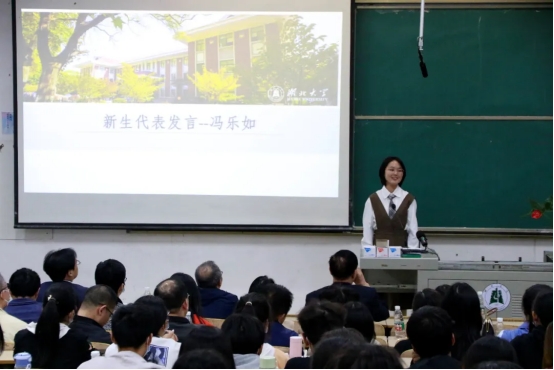 老生代表2020级教育技术学专业员工李媛媛发言,她从知惑、习道、立心三个方面与大家分享。新生代表2022级教育学专业冯乐茹同学则“忆往昔、看现在、祝未来”,坚定地表示自己要立鸿鹄志,勇于追梦,不负韶华。