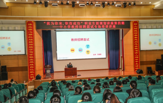 2月24日下午校员工发展与就业指导中心和beat365联合举办的“就为你来,职指成功”职业生涯规划讲座第四期——中小学教师招聘面试专场培训讲座在三号楼报告厅进行。全校有200余名师范生参加讲座。