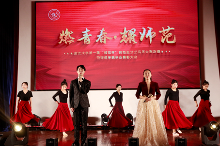 风采大赛共分为信仰之声、中华之韵、育人之道、青春之光等四个篇章。在信仰之声篇章中,来自2022级英语(师范)、2021级小学教育等专业的师范生们带来舞蹈《党旗飘扬的方向》、情景朗诵《家书》,用优美舞姿、美妙歌声致敬和深情真挚的朗诵,致敬中国共产党走过的百年辉煌岁月;在中华之韵篇章,来自2021级汉语言文学(师范类)、2021级生物科学(师范类)和2022级思想政治教育专业的师范生们带来乐器演奏《战台风》、歌曲演奏《经典咏流传》、民族乐舞《民族的就是世界的》,用古筝、竹笛、葫芦丝、冬不拉、小提琴、钢琴等乐器演奏出动人旋律,并配以诗词吟唱和民族舞蹈,让中华民族五千年的灿烂文化绽放瑰丽光芒;在育人之道篇章,来自2021级教育学(师范)、2022级学科教育(地理)专业的师范生们带来独唱《A million dreams》、小品《班会那些事》,生动展示了师范学子落实“立德树人”根本任务的决心和信心;在青春之光篇章,来自2022级教育管理、2021级教育学(师范)、2021级英语(师范)专业的师范生们以美育实践展示《长歌行》、歌舞《向阳》,生动诠释了新时代师范青年“躬耕教坛、强国有我”的青春誓言。整场晚会在《凤凰花开的路口》的动人旋律中落下帷幕,用音乐和歌声为即将投身建设教育强国事业的全体2023届师范毕业生送上最美好的祝福。
