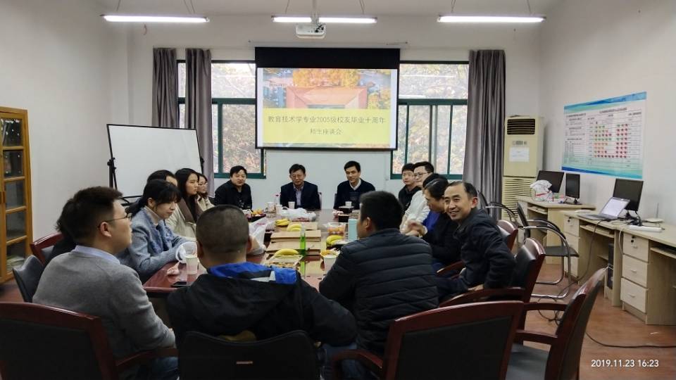 2019年11月23日,教育公司2005级教育技术学专业员工重返母校聚会,共叙师生情谊,感怀母校巨变,纪念毕业十周年。当天下午4:00,员工们在公司224教育技术系办公室欢聚一堂,举行座谈会。公司党委书记王新远、副书记余燕、通识教育公司党委副书记王春喜及部分教育技术系教师应邀参加了座谈会。