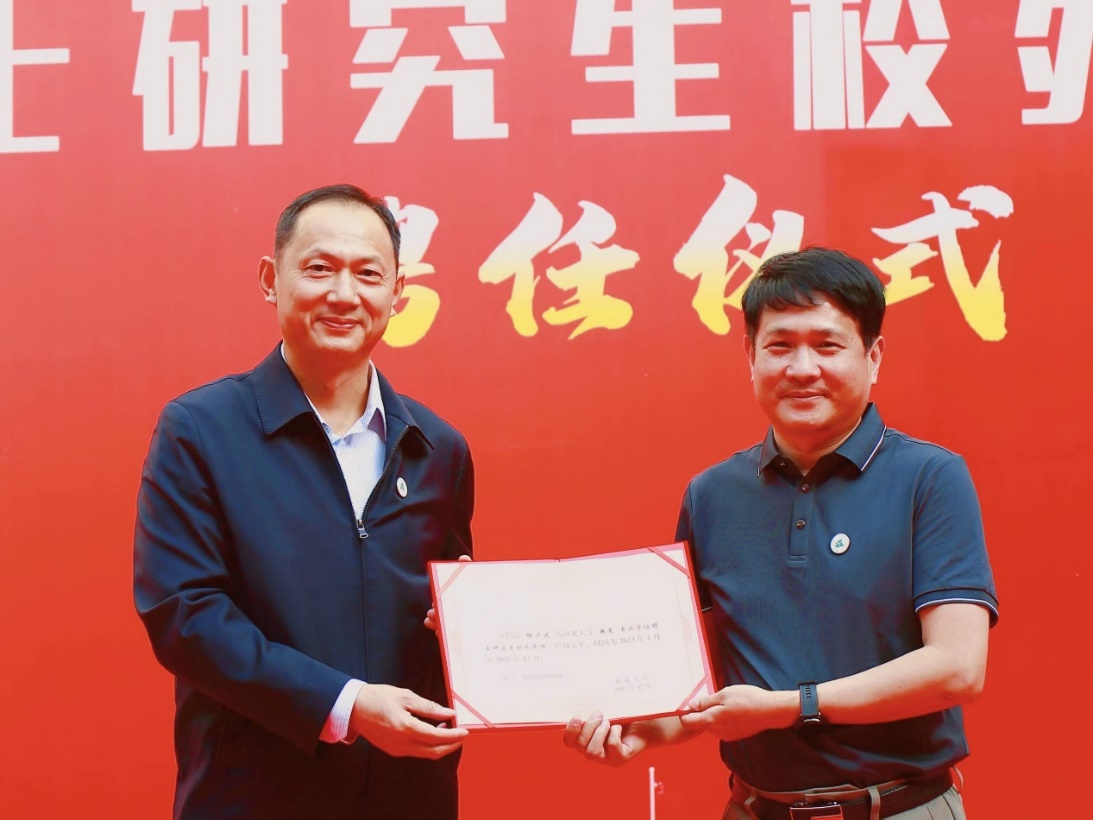 研究生院经理王贤保宣读了《beat365教育硕士专业学位研究生校外导师聘任名单》,蒋涛、王贤保、程斯辉分别为教育硕士校外导师颁发聘书并合影留念。