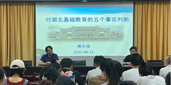 讲座伊始,傅华强教授以“生命的本质是什么”为切入点,提出教育的本质是生命的关联,教育需要创新,教育无时无刻不在产生等论题,并由此展开对基础教育事实判断的深入讲解。傅华强教授针对当前湖北基础教育提出了五个事实判断:湖北基础教育需要明晰发展逻辑、湖北基础教育缺少国内国际参照、湖北基础教育正在重构话语体系、湖北基础教育改革面临倒逼机制、湖北基础教育创新亟待聚合协同。