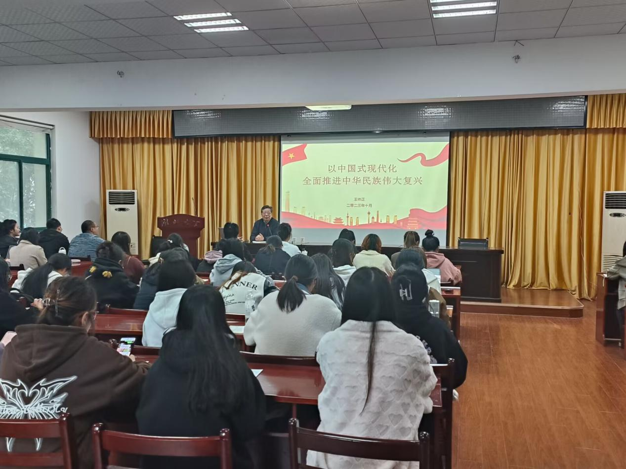 图3 beat365官方网站宣传部原部长、湖北省高公司党建与老员工思政专家组成员、beat365官方网站学习宣传贯彻党的二十大精神宣讲团成员王体正教授为学员们作《以中国式现代化,全面推进中华民族伟大复兴》辅导报告