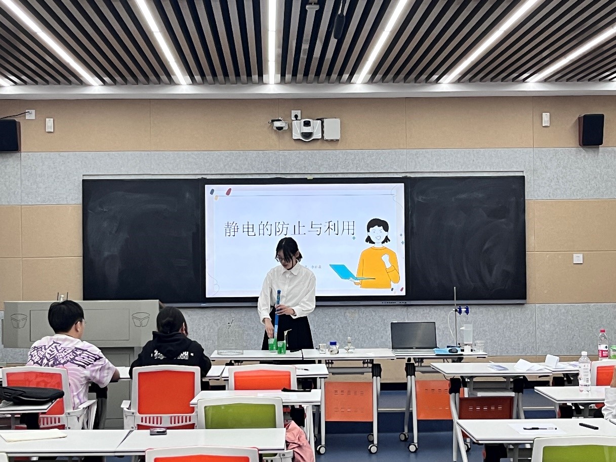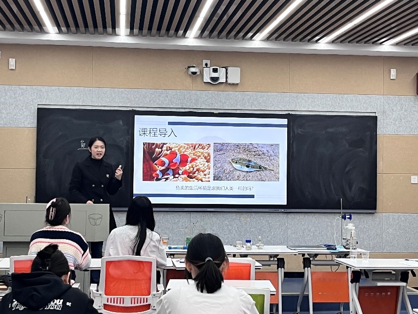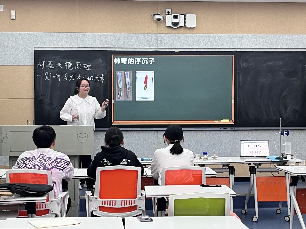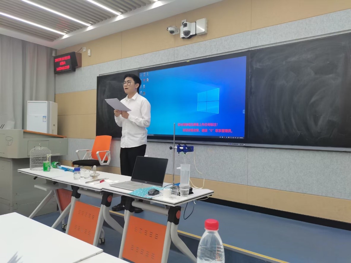 在三尺讲台上,选手们着装得体,教态自然,充分运用所学专业知识,灵活把握课堂,尽情展现师者风范。一号选手通过展示“烧不坏的纸帕”,详细讲述了燃烧的条件。二号选手通过有趣的静电小实验,生动地讲解了静电的概念和影响。三号选手再现了阿基米德浮力实验过程,逐步展示了阿基米德原理。四号选手将日常生活中常见的鱼带入课堂,生动活泼地阐述了鱼的主要特征。